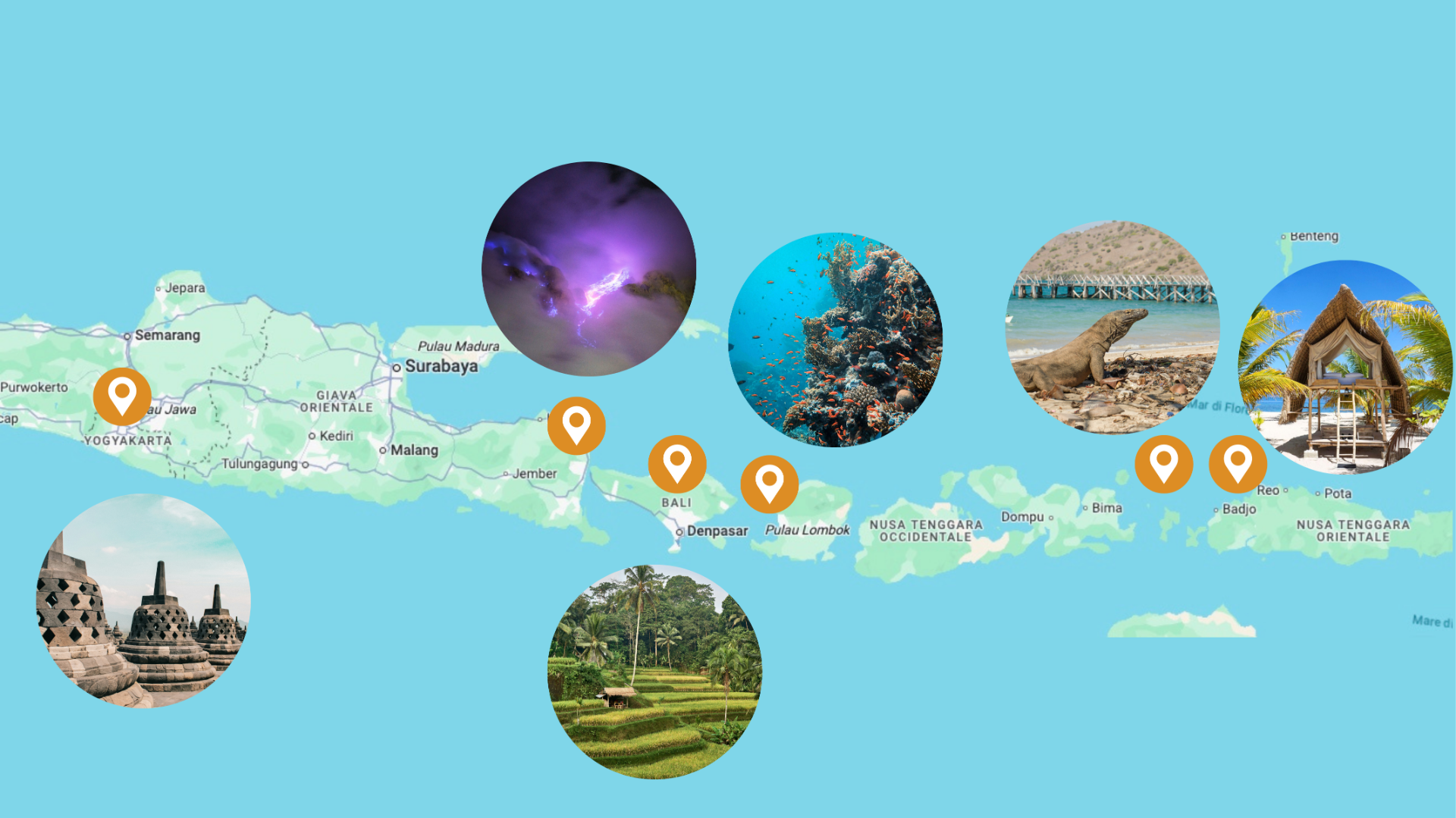 Trascorreremo un mese in Indonesia tra paesaggi mozzafiato, spiritualità e natura selvaggia. Visiteremo antichi templi buddisti avvolti nel silenzio e nella storia, ci tufferemo nelle acque cristalline per fare snorkeling tra coralli e pesci colorati, scaleremo il vulcano Kawah Ijen, famoso per le sue spettacolari fiamme blu, e andremo alla scoperta dei leggendari draghi di Komodo, immersi in una natura ancora incontaminata.